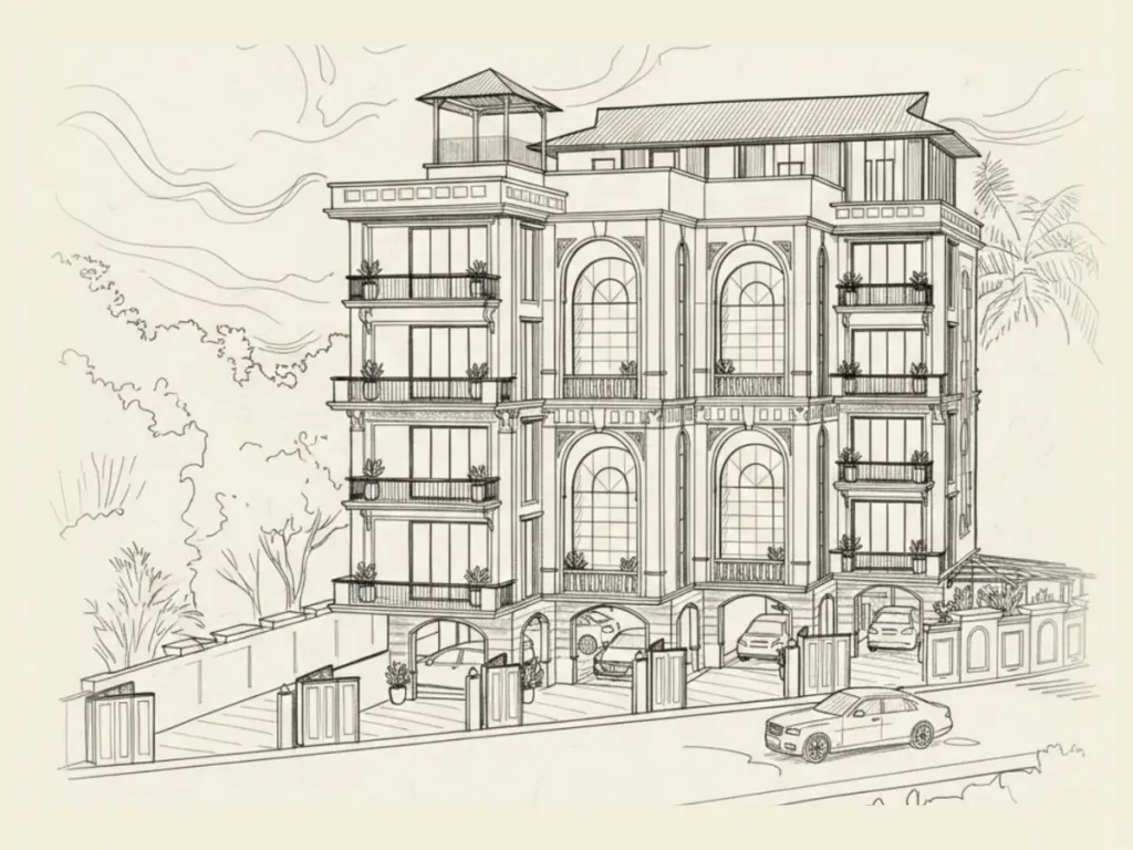 Designed by Ar. Rita Mody Joshi — a CEPT graduate, recognised for her early contribution to the India Habitat Centre while working with Joseph Allen Stein at Stein Doshi Bhalla (SDB) and for her support during the development & beautification initiative, ‘Together for Panjim’ in Goa. With more than 1,500 projects of residential, 5star hotels, institutions and commercial developments spread over 3 decades of practice – her work is deeply rooted in context-led, human-centred, and enduring architectural principles. This project reflects her disciplined yet generous design vision, where classical order and spatial richness come together to shape a dignified, lasting residential address in its own right.